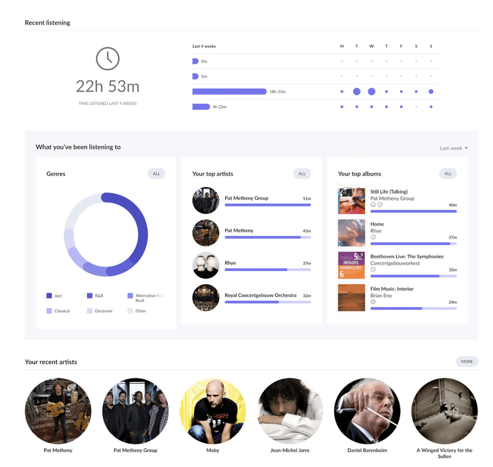 Roon, service musical domestique a fait la part belle aux data visualisations dans son profil utilisateur. Ces dernières permettent d'ailleurs de naviguer dans le contenu de manière profilée. La data visualisation est un vrai gain personnel pour suivre ses utilisations de données.