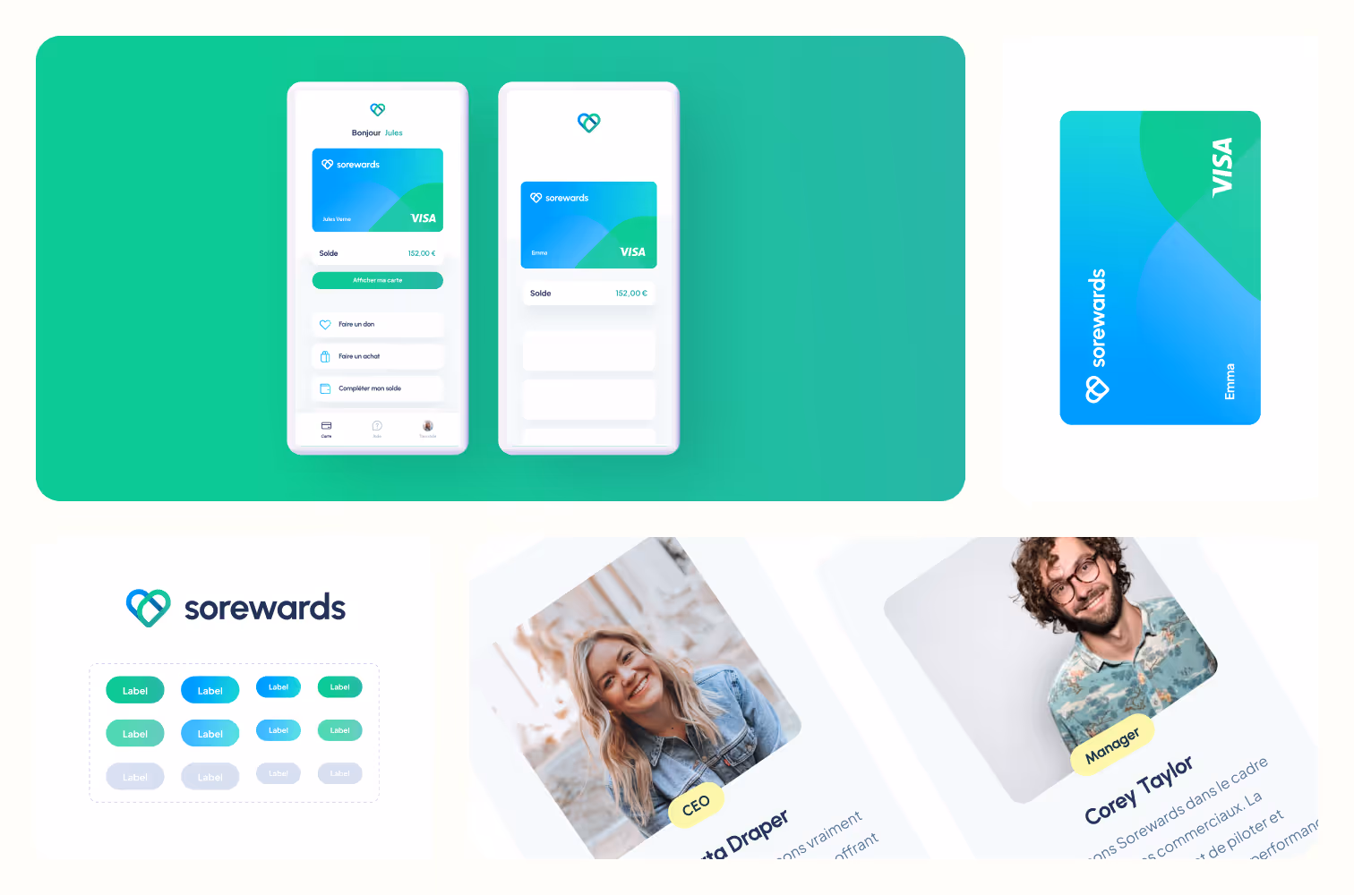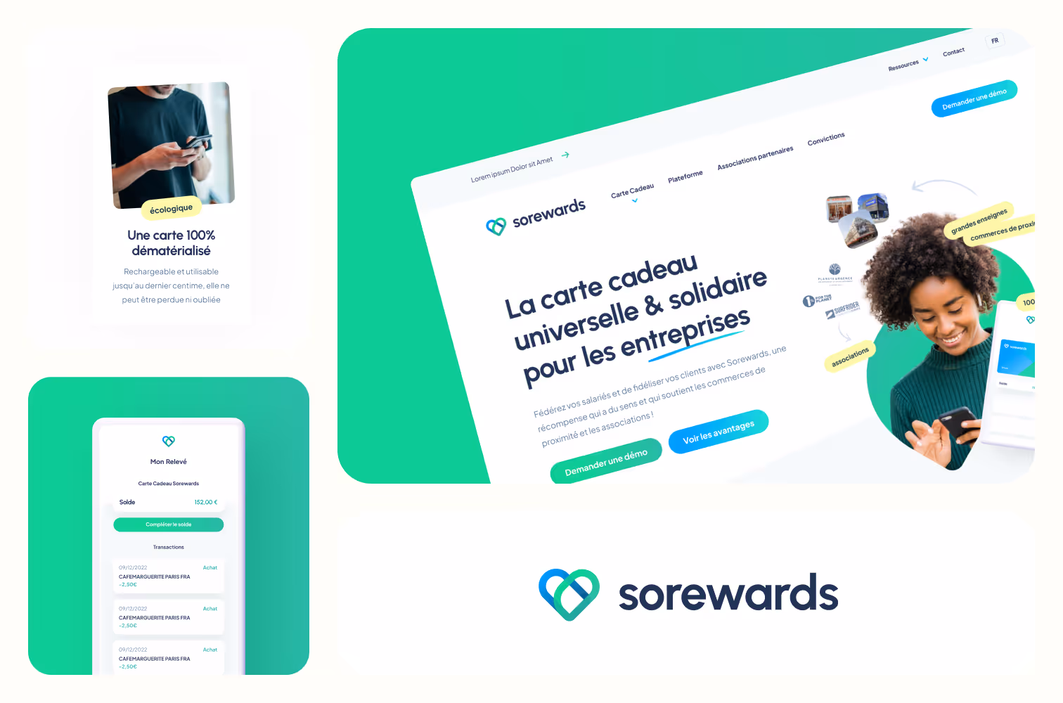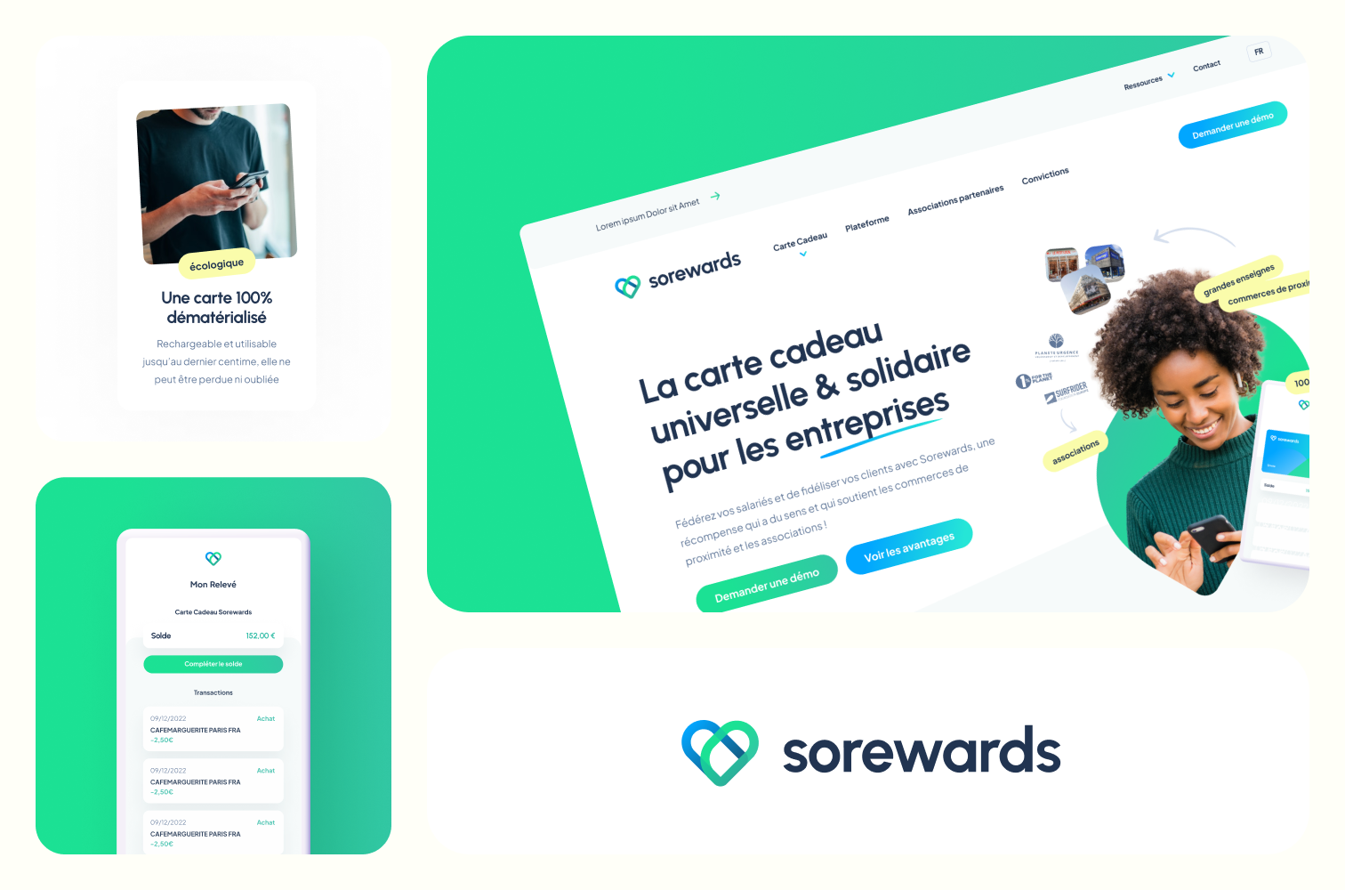 Sorewards propose aux entreprises des cartes cadeaux dématérialisées et solidaires, utilisables dans de nombreux commerces et intégrables à Apple Pay et Google Pay. La marque nous a sollicités pour refondre son site web et son identité graphique, afin de proposer une expérience plus moderne, fluide et cohérente avec son engagement social.